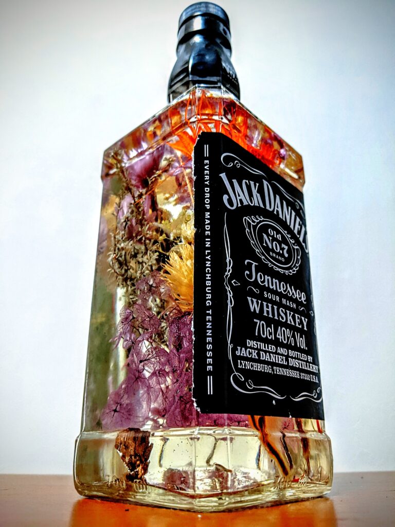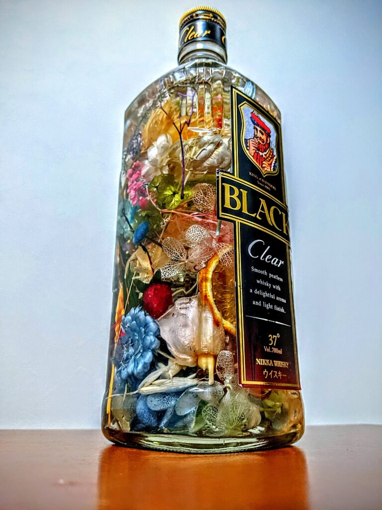 ブラックニッカには何を入れるか迷いましたが、絵の具はたくさんの色を入れると黒くなる、という原理に着想を得て、余っているドライフラワーを全部ぶっこんでみました。