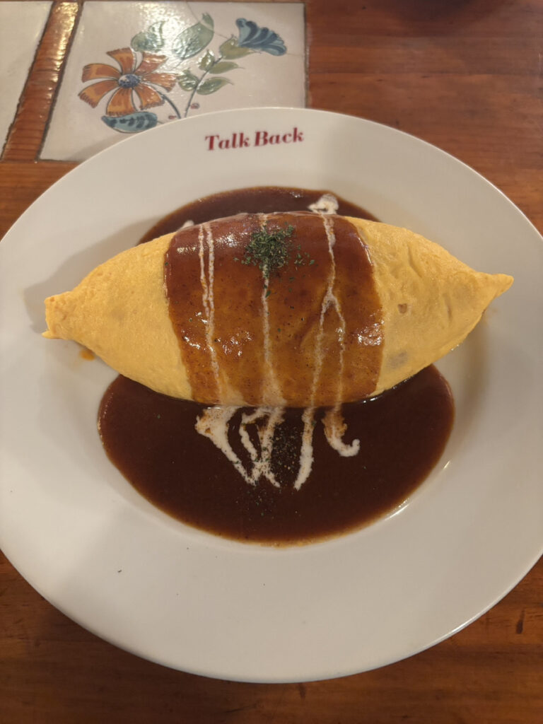 これぞ「THE 王道オムライス」。吉祥寺の中道通り沿いにあるフレンチビストロ「トークバック」のオムライスです。卵はふわとろ系で、中からしっとりとしたチキンライスが登場します。