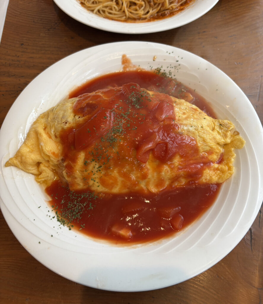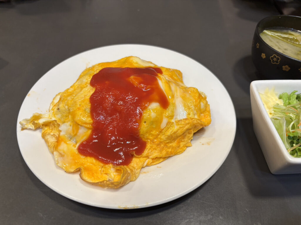 ケチャップで炒められたごはんを、黄色いふわふわが包み込む魔法のような料理。