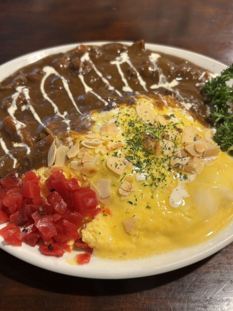 オムライスなのかカレーライスなのかでいうと、中身がターメリックライスなのでカレーライスなのかもしれません。スパイスの効いたカレールーに、ふわふわたまごが合わさると、それはまあとっても美味しい。