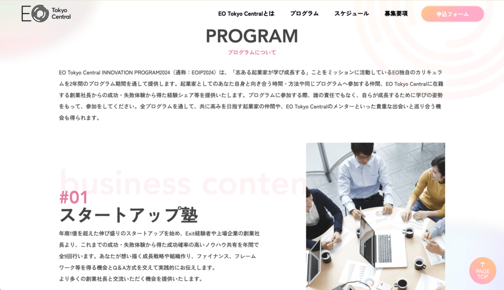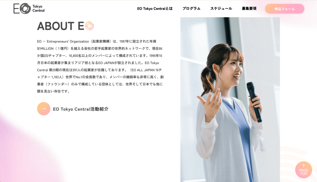 EO Tokyo Central様のイノベーションプログラム告知サイトを制作しました。魅力価格総額1兆円以上の起業家ネットワークを活かし、成長意欲のあるスタートアップを募集するという目的に合わせて、「信頼感」と「挑戦心」の両立を意識したデザインを設計。
