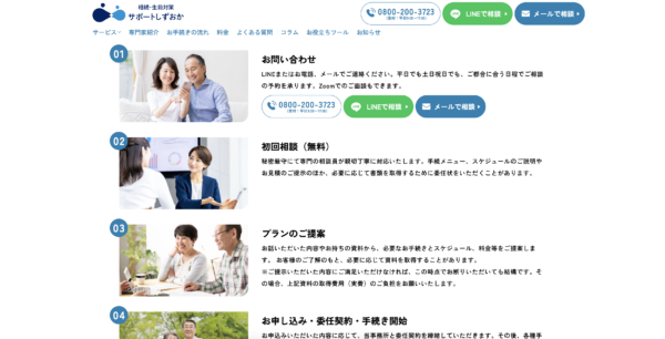 閲覧される方の年齢層を考え、テキストサイズやイメージ写真をなるべく大きくわかりやすく設定しています。また、簡易的なフローの図を使用した詳細説明を導入。相続や生前対策について初めて考える・知る方にも優しいデザインになっています。全体で統一して角丸のオブジェクトを使用することでやわらかく親しみやすい印象を与えています。