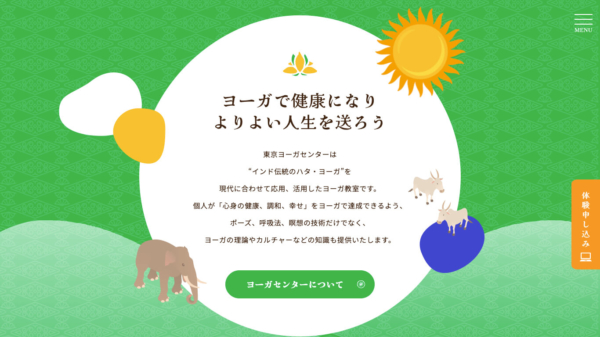 基調色として、落ち着いたグリーンや深みのあるブルー、マスタードイエローといった自然界やインド文化を連想させるカラーを大胆に使用しています。セクションごとに背景色を大きく変えることで、単調さを避け、サイト全体に動きとリズムを与えています。特に、黄、青、緑の原色に近い色使いは、ポップで親しみやすい印象と、ヨガが持つエネルギーを表現しています。また、ところどころに配された抽象的なイラストや図形(太陽、月、丸、三角など)が、スピリチュアルな要素を象徴的に示しています。