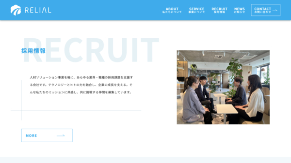 メインカラーには、トップビジュアルの青空を象徴する鮮やかでクリアなブルーを採用し、これを背景の白と組み合わせています。この配色は、企業の透明性、信頼性、そして成長(空の広がり)といったポジティブなイメージを強く伝えます。特に、淡い水色やグレーのアクセントが加わることで、先進性とクリーンな印象を強調し、訪問者に爽快感と安心感を与えます。